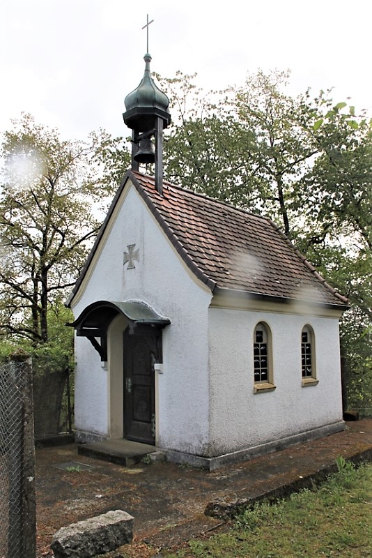 Gedenkkapelle auf einem Hügel oberhalb vom Ort. Holzschnitzereien und Inschriften außen an der Eingangstür und darüber Deutsches Kreuz,