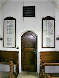 Text im Bogen über dem Altarraum, zwei Gedenktafeln neben dem Eingang, eine Gedenktafel zur Entstehung der Kapelle über dem Eingang.