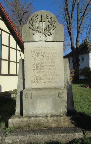 Das Kriegerdenkmal vor der Kirche wurde in Zusammenhang mit der Restaurierung der Kirche offensichtlich gesäubert. Es besteht aus drei wesentlichen Teilen, die auf einem breiteren Fundament ruhen. Zwei kubische Blöcke mit Inschriften werden nach oben mit einem abgerundeten Teil abgeschlossen. Auf diesem sind im Halbrelief ein nach unten gerichtetes Schwert dargestellt, das von Eichenlaub umkränzt wird.