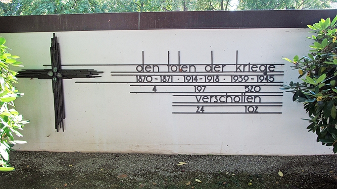 An der Friedhofsmauer gedenkt eine Inschrift der Opfer der drei letzten Kriege.