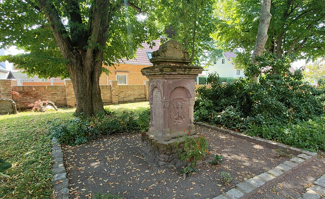 Reich verziertes Sandsteindenkmal mit krönendem Tatzenkreuz auf dem Kirchhof.