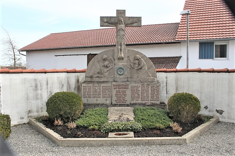 Kriegerdenkmal: Steinsockel mit Namen. Darüber ein Steinkreuz mit zwei Steinbögen an den Seiten.