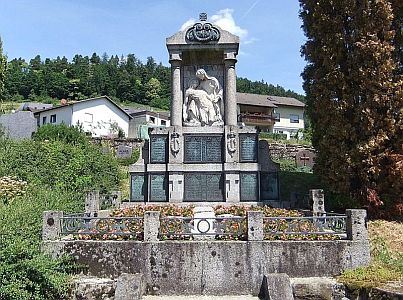 Mehrstöckiges Ehrenmal mit insgesamt acht Gedenktafeln. Darüber einem Tempeleingang nachempfundener Aufsatz, darin eine Pieta.