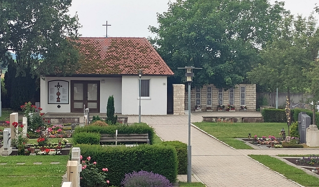 Gedenktafel an der Aussegnungshalle des Kirchfriedhofs für den 2. Weltkrieg mit Todesdatum.