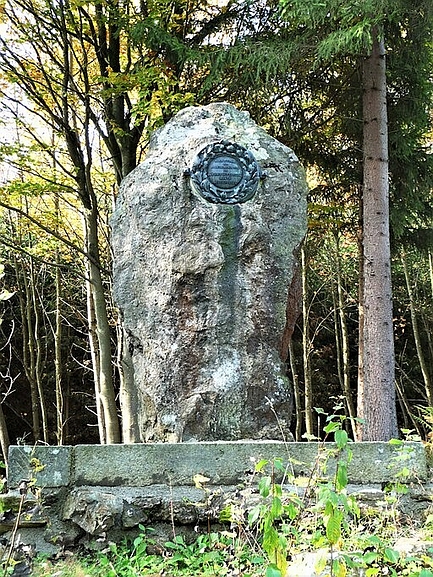 Kreisrunde Gedenktafel mit Eichenlaubkranz aus Metallguss, an Findlingsstein auf Granitsockel.