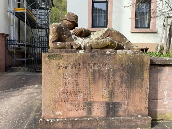 Zwei Sandsteinplatten: Auf einer der Platten ist als Skulptur ein liegender, verwundeter Soldat.