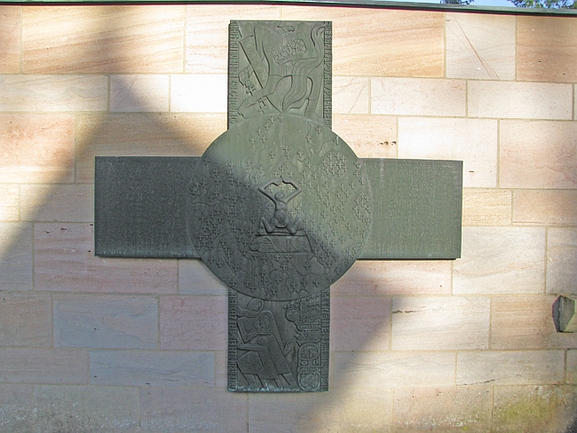 Auf der Mauer des Waldfriedhofs wurde eine moderne in Kreuzform gestaltete Metalltafel angebracht,