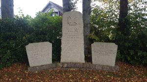 Seitlich zwei kleinere Steine für die Kriegstoten des Zweiten Weltkrieges.