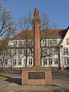 Podest mit Sandsteinen verkleidet, darauf eine achteckige Säule, auf der ein Adler thront.