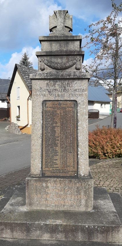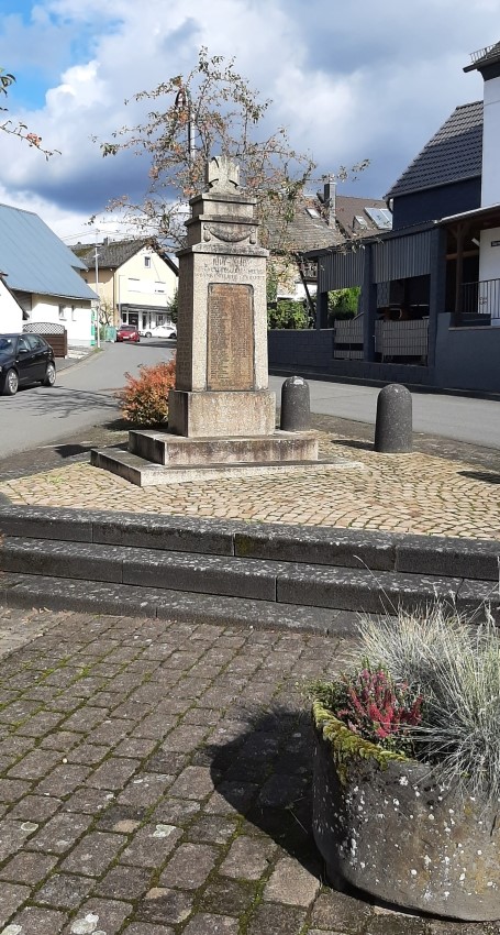 Ein Teilobelisk ruht auf einem dreistufigen Sockel, oben auf ein Eisernes Kreuz. Auf der Frontseite - ursprünglich wohl mit den Daten des Ersten Weltkrieges versehen - die Namenstafel mit den Daten des Zweiten Weltkriegs.