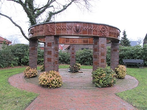 Kreisrundes begehbares ca. 10 m im Durchmesser messendes und auf 7 Pfeilern ruhendes, aus Klinkersteinen und glasierten Kacheln erbautes Ehrenmal.