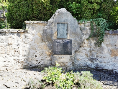 Mehrstufige halbrunde Mauer in deren Mitte ein Steinfindling mit Gedenktafel eingefügt ist.