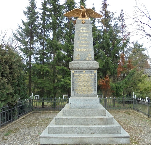 Denkmalstele mit krönendem Adler in der Nähe des Friedhofs für die Gefallenen des Ersten Weltkriegs.