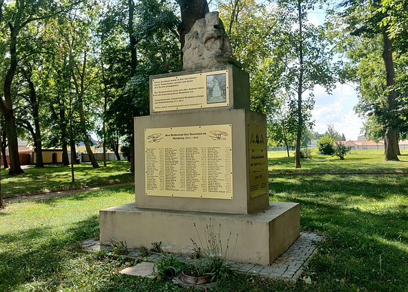 Die Weiherede hielt Pfarrer Matthesius. Das Denkmal, geschaffen von dem Schkopauer Bildhauer Paul Juckoff, ist aus rheinischem Tuffstein.