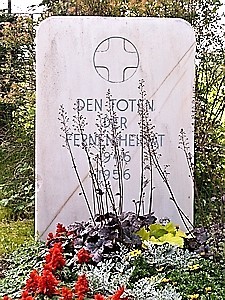 Friedhof: Modern gestalteter heller Gedenkstein unmittelbar bei der Aussegnungshalle.