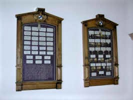 Im Vorraum der Kirche auf zwei holzgerahmten Tafeln hinter Glas 52 Gedenkplaketten für verstorbene und gefallene Kriegsteilnehmer,