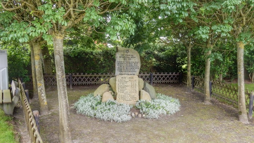 Gesäumt von drei kleinen Bäumen, eingefasst von einem Scherenzaun, das Gefallenenmahnmal von Spieka-Neufeld. Auf einigen aufgeschichteten Findlingen, zuoberst ein Gedenkstein mit den Namen der Gefallenen und Vermissten des Ersten Weltkriegs, unterhalb wie angelehnt eine mit den Namen deren des Zweiten Weltkriegs.