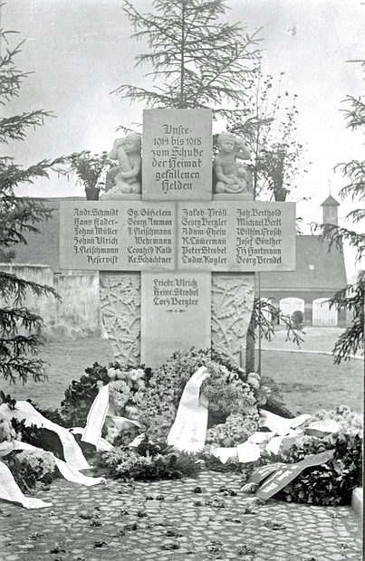 Auf dem Foto von 1938 sind die Namen und Inschrift lesbar. Ursprünglich stand das Denkmal beim Gästehaus Kalb, nahe der Feuerwehr (siehe Fürth Wiki).