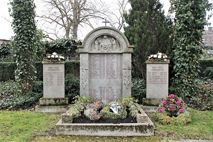Dreiteiliges Denkmal im Friedhof. Zusätzlich Daten von privaten Gedenksteinen.