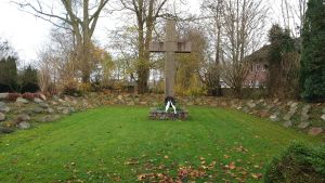 Der am 15.11.1953 eingeweihte Ehrenfriedhof von Steinbergkirche für die Opfer beider Weltkriege befindet sich im Eingangsbereich des separaten östlichen Teils des an der Kirche St. Martin gelegenen Friedhofes. Weithin erkennbar erhebt sich auf einem aus Feldsteinen gemauerten Podest ein 5 m hohes Granitkreuz in der Mitte einer, durch einen umlaufenden Wall aus gemauerten Granitquadern begrenzten, quadratischen Anlage. Die Außenseite des Walles ist heute teilweise mit Buschwerk begrünt. In die Erde der abgeschrägten inneren Böschungen der Wälle sind - jeweils um einen etwas größeren Stein mit dem Namen des Heimatsortes gruppiert - Kissenfindlinge unterschiedlicher Färbung eingebettet, die die Namen und Lebensdaten der Gefallenen oder Vermissten tragen. Die Inschriften sind unterschiedlich gut erhalten, teilweise ist die Schrift ausgewaschen und nicht mehr lesbar.