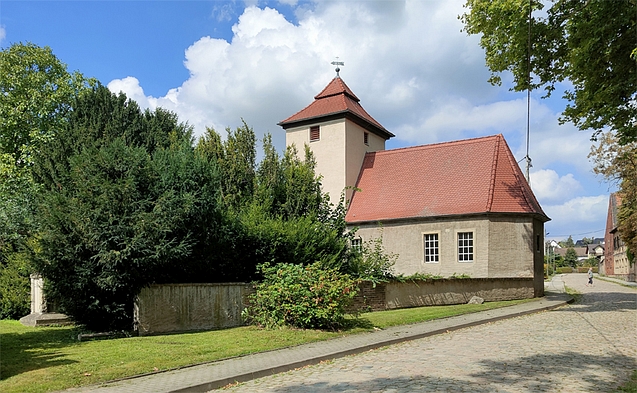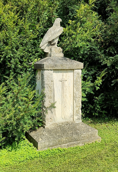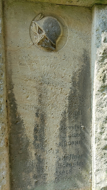 Das Denkmal für den 1. Weltkrieg steht links von der Kirche, etwas verdeckt von Büschen.