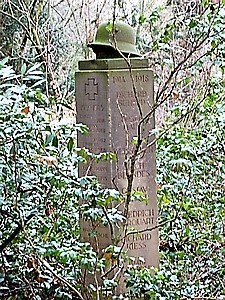 Denkmal im Garten des Verbindungshauses (Eugenstraße 22.), oben abgeschlossen von einem steinernen Stahlhelm.