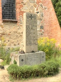 Vor der Dorfkirche, einer gotischen Feldsteinkirche, steht das Ehrenmal für die 16 Kriegstoten des Ersten Weltkrieges.