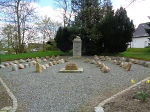 Vor dem Ehrenmal die Namen der Opfer des Zweiten Weltkrieges auf kleinen Findlingen.