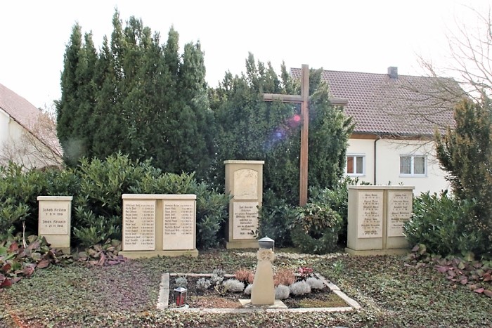 Denkmal bei der Kirche, ein Kriegsgrab vor dem Denkmal.