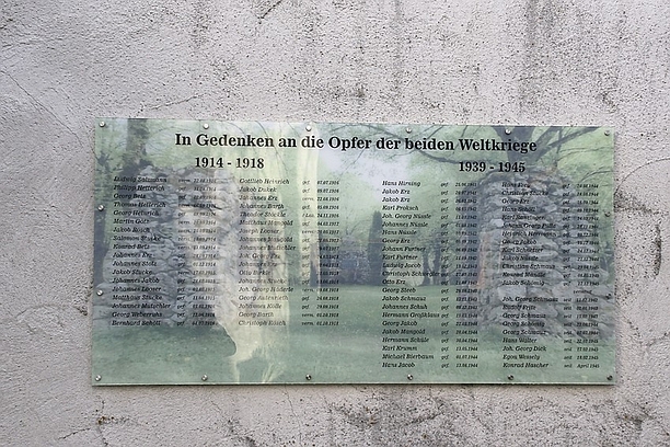 Glastafel an der Friedhofsmauer und ein Soldatengrab.