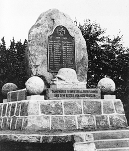 Ehemaliges Denkmal für die Gefallenen des 1. Weltkriegs. Sockel aus Natursteinblöcken und aufgesetztem Findling mit angebrachter Namenstafel. Sockel begrenzt von vier Steinkugeln und Stahlhelm-Plastik (abgerissen).