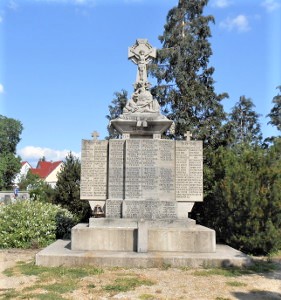 Denkmal auf dem Friedhof bestehend aus mehreren Steintafeln, in der Mitte Tafeln mit der Jahreszahl 1914-1918 und den Namen des Ersten Weltkriegs.