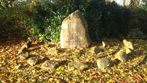 In einer kleinen Anlage ein großer Findling mit Inschrift,