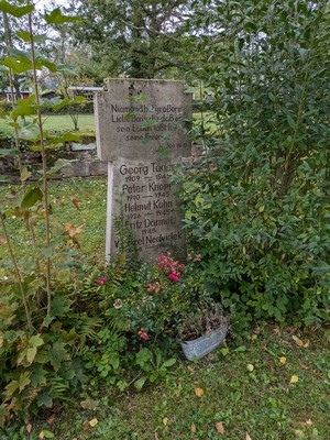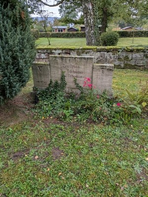 Eine Grabstätte mit Gedenkstein in stilisierter Kreuzform erinnert an fünf KZ-Häftlinge eines Todesmarsches des KZ Buchenwald, die im April 1945 von SS-Männern ermordet wurden.