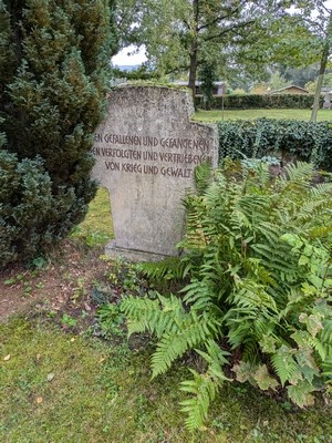 Eine Anlage aus in drei Felder geteilter Gedenkstätte ehrt die Opfer von Faschismus (VVN) und der dritte Gedenkstein ehrt alle Opfer.