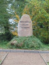 Große Gedenkanlage für die Gefallenen beider Weltkriege. In der Mitte auf einem Podest ein Findling mit Inschrift.
