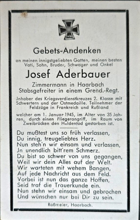 Stabsgefreiter | ADERBAUER | Josef | 31.10.1910 Niederham | 01.01.1945 Raum Zweibrücken, Bliesdalheim, Deutschland | Grend. Regt. | durch einen Fliegerangriff |