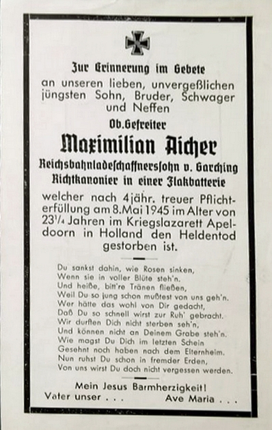 Obergefreiter Richtkanonier | AICHER | Maximilian | 10.02.1922 Kronberg | 08.05.1945 Kriegslazarett Apeldoorn | Flakbatterie | Kriegsgräberstätte in Ysselsteyn: Block AB Reihe 7 Grab 174 |