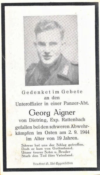Unteroffizier | AIGNER | Georg | Dietring, Exp. Rattenbach | 02.09.1944 im Osten |