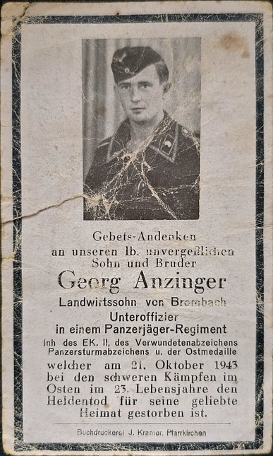 Unteroffizier Obergefreiter | ANZINGER | Georg | 29.12.1920 Brombach | 21.10.1943 im Osten, Ukrainka | 1. Komp. Panzerjäger Regiment Abt. 27 |