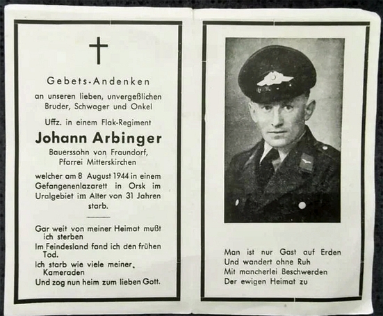 Unteroffizier | ARBINGER | Johann | 01.09.1913 21.09.1913 Fraundorf | 08.08.1944 07.08.1944 Gefangenen-Lazarett Orsk |