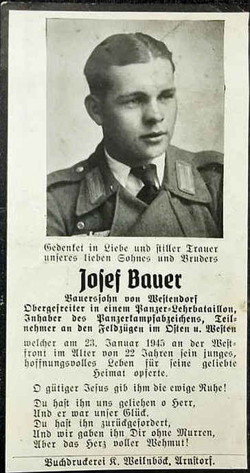 Obergefreiter | BAUER | Josef | 14.11.1922 Westendorf Westerndorf | 23.01.1945 Westfront | Panzer-Lehrbataillon | Kriegsgräberstätte in Daleiden: Block B Grab 14 |
