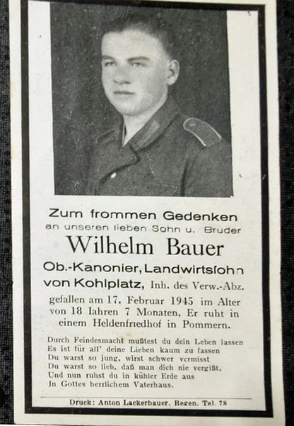 Oberkanonier | BAUER | Wilhelm | 13.06.1926 Brandl | 17.02.1945 Glambeck | begraben in Pommern, Grab derzeit noch in: Suliborz - Polen |