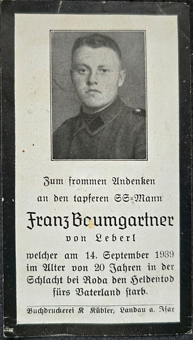 SS-Mann | BAUMGARTNER | Franz | 25.01.1919 Mettenhausen | 14.09.1939 1 km nördl. Ruda, Polen |