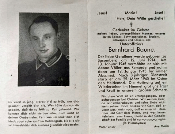 Unteroffizier | BAUNE | Bernhard | 12.06.1914 Sassenberg | 25.03.1945 im Osten 24.02.1945 Dreimani bei Auce, Lettland |