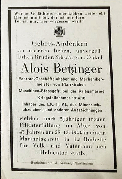 Maschinen-Stabsgefreiter | BETZINGER | Alois | 23.09.1897 Rosenheim | 28.12.1944 Marinelazarett La Rochelle | Kriegsmarine | gestorben, Kriegsgräberstätte in Berneuil: Block 5 Reihe 6 Grab 233 |
