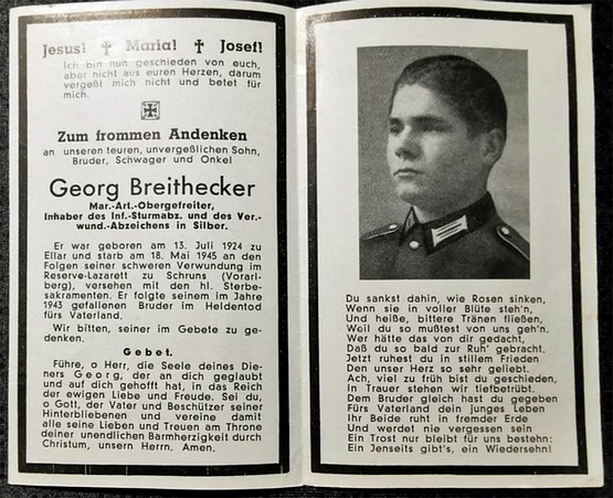 Mar.-Art.-Obergefreiter | BREITHECKER | Georg | 13.07.1924 Ellar | 18.05.1945 Reserve‑Lazarett Schruns (Vorarlberg) | gestorben, Soldatenfriedhof Trosters, Reihe XXI |