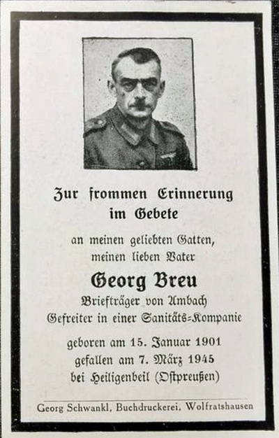 Gefreiter | BREU | Georg | 15.01.1901 Eschlkam | 07.03.1945 Krankensammelstelle Rosenberg bei Heiligenbei, (Ostpreußen) | Sanitäts-Kompanie | Kriegsgräberstätte in Mamonovo: Block 2 Reihe 14 Grab 671 |