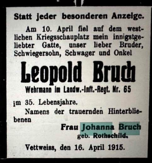 Wehrmann | BRUCH | Leopold | 22.09.1880 Vettweiß | 11.04.1915 westlicher Kriegsschauplatz | Landw.-Inf.-Regt. Nr. 65, 8.Komp. | im 35. Lebensjahre |
