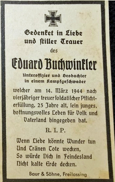 Unteroffizier | BUCHWINKLER | Eduard | 16.03.1919 Hiltenfingen | 14.03.1944 Cavoures bei Abbeville, Somme | 4. Staffel Kampfgeschwader 30 | gestorben, Kriegsgräberstätte in Bourdon: Block 32 Reihe 13 Grab 505 |
